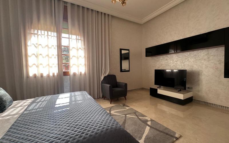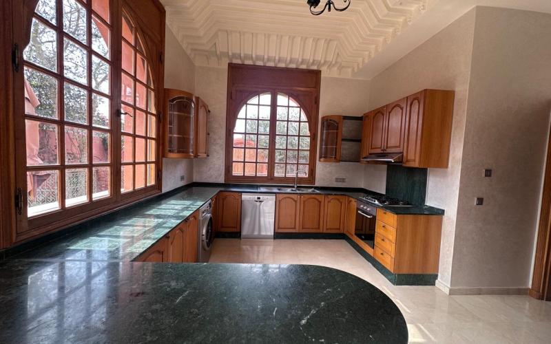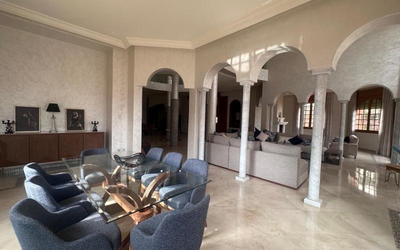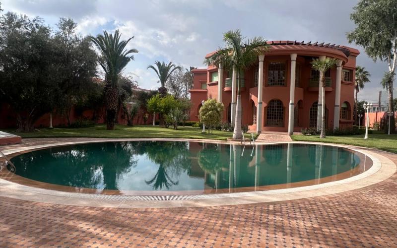 "> Located in the highly sought-after Agdal district of Marrakech, within a secure and upscale residential area composed exclusively of prestigious villas, this exceptional property offered by Promo Immo Marrakech perfectly combines elegance, comfort, and authentic Moroccan charm. Built on a beautifully landscaped plot of 2,600 sqm, this independent villa stands out for its impressive volumes, natural brightness, and high-quality finishes, making it ideal for a demanding clientele seeking a refined long-term living experience.Upon entering, the villa reveals a grand entrance hall enhanced with traditional zellige craftsmanship, leading to a spectacular double-height reception area flooded with natural light. The living space includes a modern European-style lounge, an authentic Moroccan salon featuring a carved cedar wood ceiling, a cozy fireplace area, and multiple dining spaces, creating a warm yet prestigious atmosphere. Large openings seamlessly connect the indoor spaces to the garden and pool, offering a perfect indoor-outdoor lifestyle.