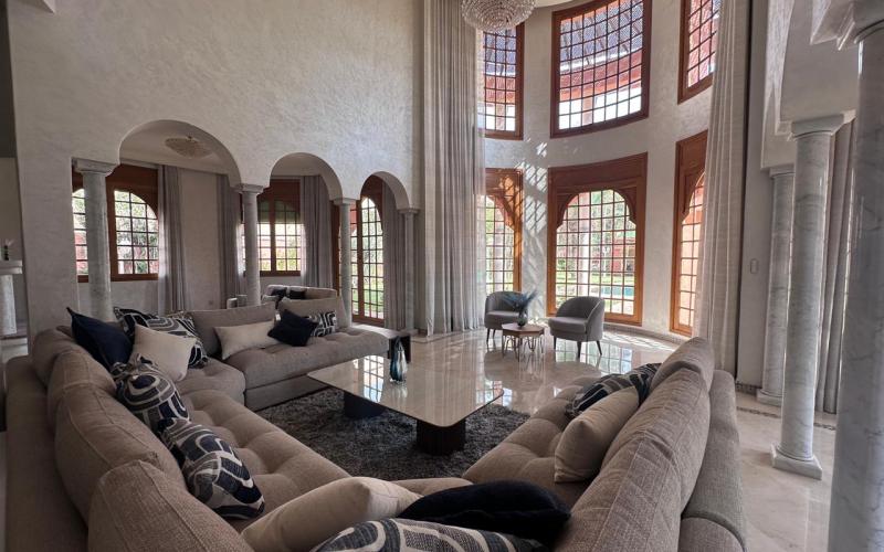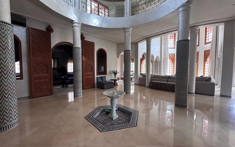 Upon entering, the villa reveals a grand entrance hall enhanced with traditional zellige craftsmanship, leading to a spectacular double-height reception area flooded with natural light. The living space includes a modern European-style lounge, an authentic Moroccan salon featuring a carved cedar wood ceiling, a cozy fireplace area, and multiple dining spaces, creating a warm yet prestigious atmosphere. Large openings seamlessly connect the indoor spaces to the garden and pool, offering a perfect indoor-outdoor lifestyle.
