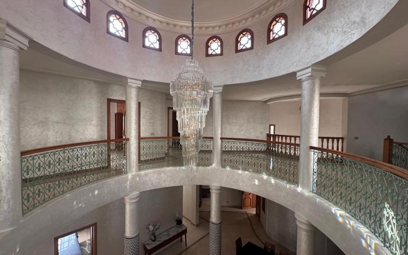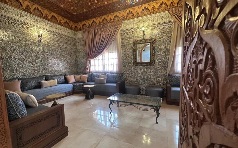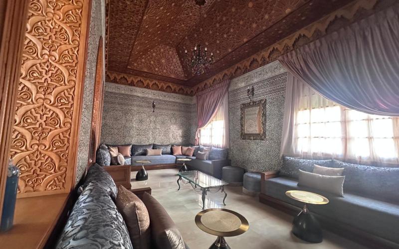 " /> Located in the highly sought-after Agdal district of Marrakech, within a secure and upscale residential area composed exclusively of prestigious villas, this exceptional property offered by Promo Immo Marrakech perfectly combines elegance, comfort, and authentic Moroccan charm. Built on a beautifully landscaped plot of 2,600 sqm, this independent villa stands out for its impressive volumes, natural brightness, and high-quality finishes, making it ideal for a demanding clientele seeking a refined long-term living experience.Upon entering, the villa reveals a grand entrance hall enhanced with traditional zellige craftsmanship, leading to a spectacular double-height reception area flooded with natural light. The living space includes a modern European-style lounge, an authentic Moroccan salon featuring a carved cedar wood ceiling, a cozy fireplace area, and multiple dining spaces, creating a warm yet prestigious atmosphere. Large openings seamlessly connect the indoor spaces to the garden and pool, offering a perfect indoor-outdoor lifestyle.