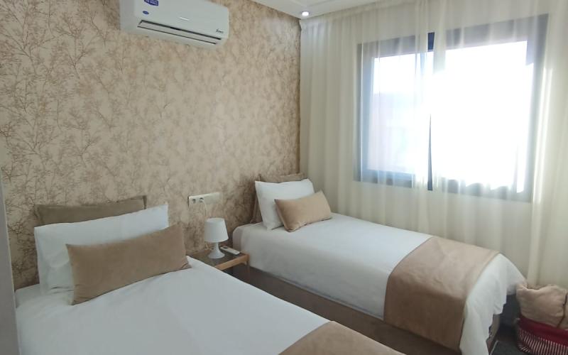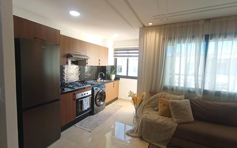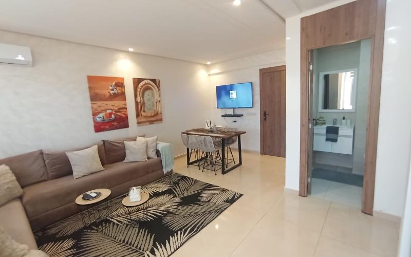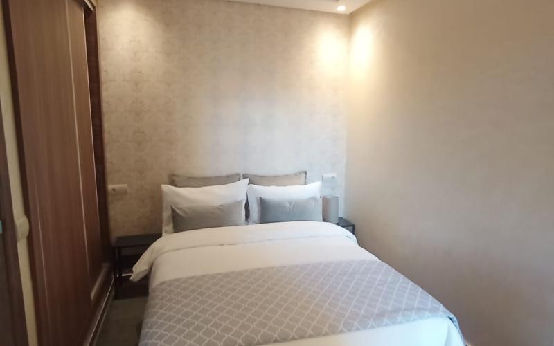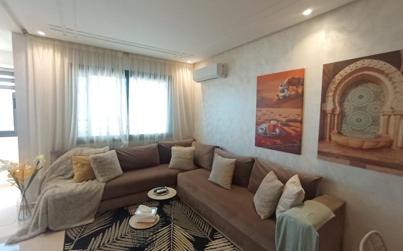 À louer en longue durée, élégant appartement meublé de haut standing situé au 4ᵉ étage d’une résidence sécurisée et bien entretenue avec deux ascenseurs, dans le quartier prisé d’Izdihar à Marrakech. D’une superficie de 53 m², il offre un espace lumineux et parfaitement agencé comprenant deux chambres confortables, un salon accueillant, une salle de bain moderne, une cuisine entièrement équipée ainsi qu’un balcon avec un agréable vu sur la piscine. Entièrement climatisé et meublé avec soin, cet appartement prêt à vivre bénéficie d’un emplacement stratégique à proximité immédiate des commerces, écoles, transports et commodités. Les frais de syndic, d’un montant de 400 MAD par mois, sont inclus dans le loyer.
