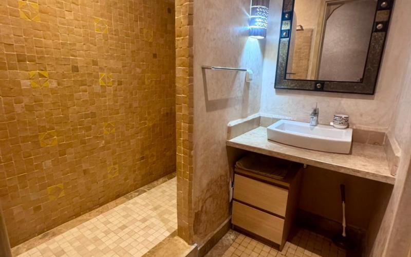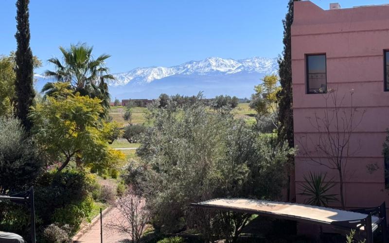 une surface de 99m2 composé de deux chambres, un grand salon avec une cuisine ,une salle de bain et une toilette invitée. Dotée d’une climatisation centrale.une jolie résidence golfique avec piscine ,jardin et une magnifique vu sur l Atlas , sécurisée ,calme et atmosphère d un air pure situé sur la route d ourika. Résidence sécurisée 24/24