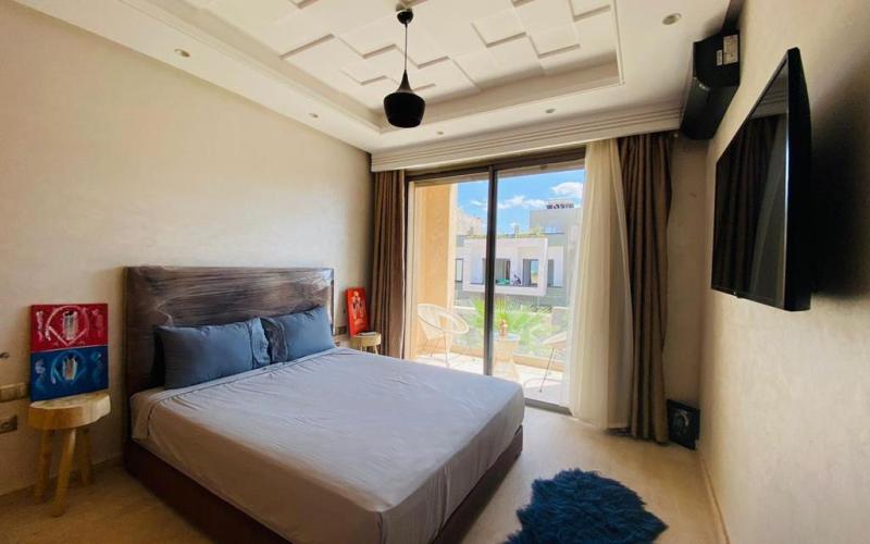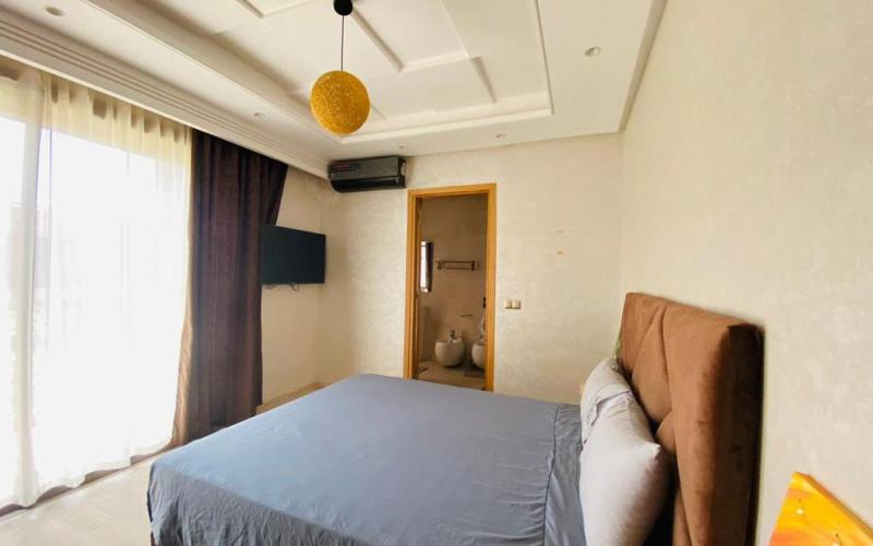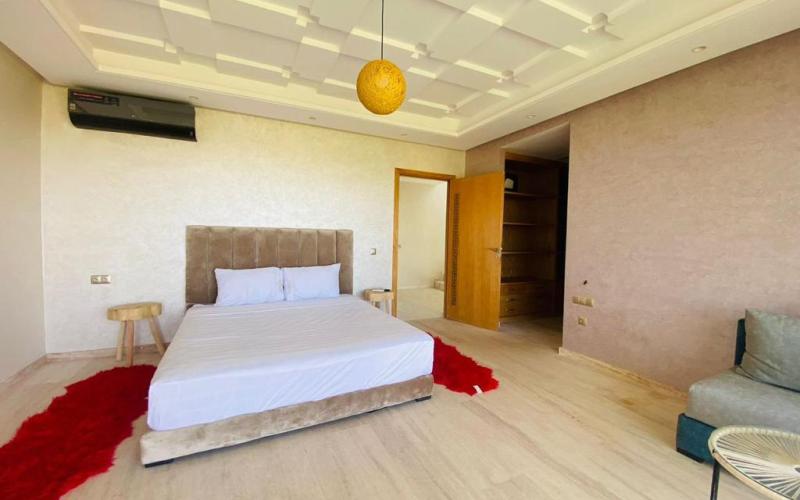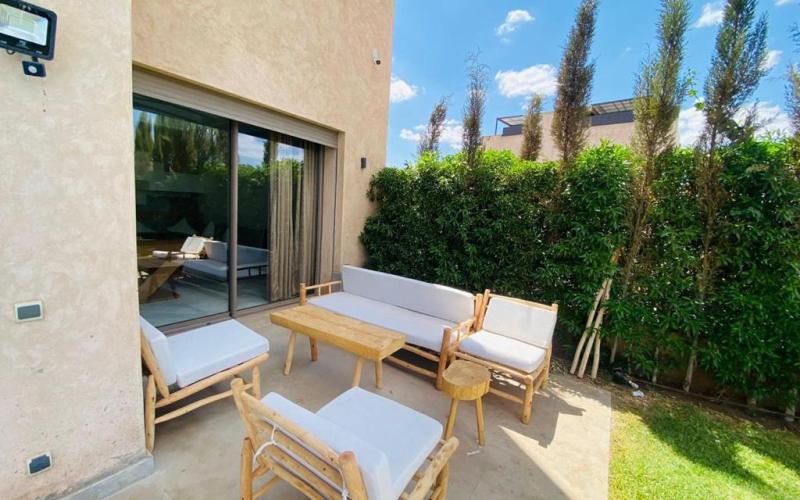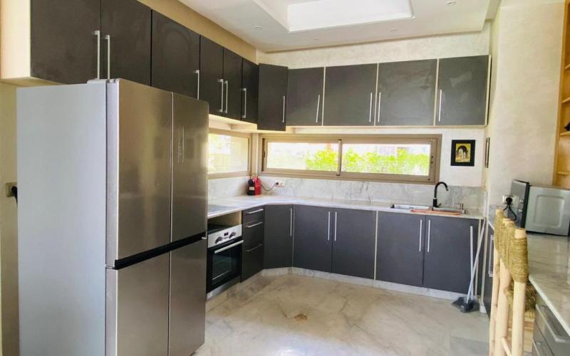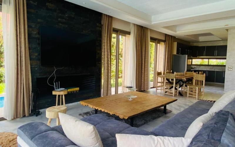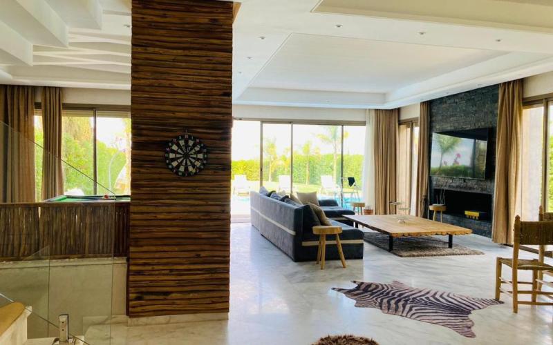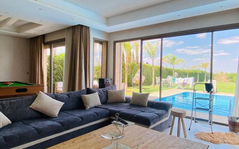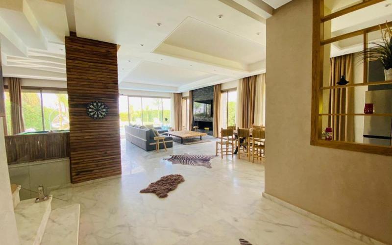 PROMO IMMO MARRAKECH vous propose Cette élégante villa contemporaine en R+1, entièrement meublée, équipée et titrée, séduit par ses volumes généreux, sa belle luminosité et son cadre de vie paisible au cœur du Golf Argan Chrifia.Édifiée sur un terrain de 600 m² pour une surface habitable de 320 m², la villa offre au rez-de-chaussée un vaste espace de vie réunissant salon, salle à manger et espaces de détente, ouvert sur l’extérieur grâce à de larges baies vitrées donnant sur la terrasse, le jardin et la piscine. La continuité intérieur/extérieur crée une atmosphère conviviale et raffinée. Une cuisine entièrement équipée, une salle de bain invités ainsi qu’un espace loisirs avec table de billard (pool 8) complètent ce niveau.À l’étage, l’espace nuit accueille 4 chambres confortables et meublées, dont une chambre avec salle de bain privative, un grand dressing indépendant et une salle de bain avec baignoire. Les chambres bénéficient d’une belle luminosité et d’une vue dégagée sur le jardin. À l’extérieur, un jardin soigneusement entretenu, une grande piscine privée et des espaces détente offrent un cadre idéal pour profiter du climat de Marrakech, en toute tranquillité et sans vis-à-vis.