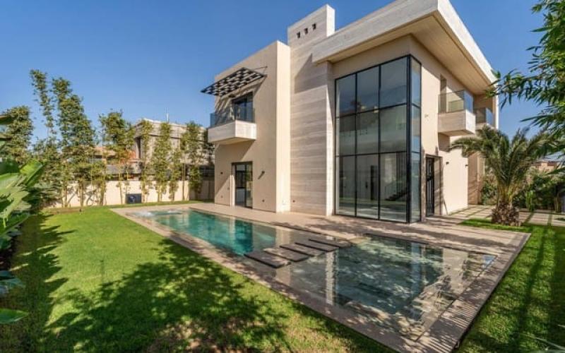 Une magnifique villa à vendre au Golf Noria à Marrakech, d’une superficie de terrain de 560m² et d’une surface couverte de 497 m². Elle est composée de cinq suites parentales, chacune avec salle de bain privative. Le double salon lumineux est idéal pour créer une ambiance conviviale en famille ou entre amis. La villa dispose également d’une cuisine équipée haut de gamme et d’un jardin exotique qui procure une atmosphère fraîche et relaxante. La piscine chauffée avec effet miroir et le jacuzzi encastré ajoutent une touche de luxe et de détente. Un parking privé pour deux voitures est inclus, ainsi qu’un système d’arrosage automatique permettant un entretien facile et la pleine jouissance de cet espace extérieur Somptueux.